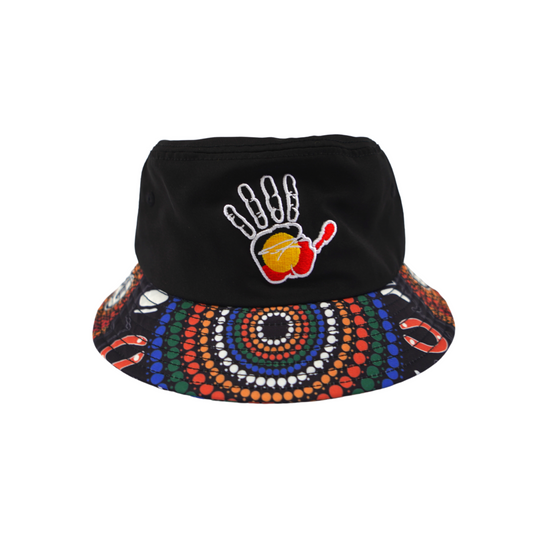 Black bucket hat featuring designed brim